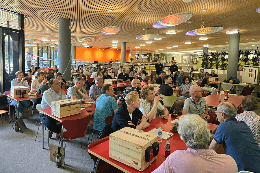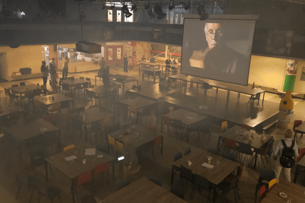 In de zaal dient voor elk team een tafel op kleine afstand van elkaar te staan. Deel de ruimte zo in dat alle teams de video en timer (op het grote scherm) kunnen zien en horen.