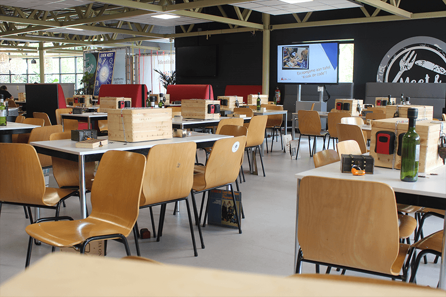 Willen jullie op een introductiedag of feestdag met meerdere klassen of opleidingen tegelijkertijd de escape rooms spelen? Dan kan dat in plaats van 4 groepjes per klas ook gezamenlijk in bijvoorbeeld één grote ruimte zoals de kantine, aula of gymzaal! Zorg wel dat de spelers het scherm met de gezamenlijke video kunnen blijven zien en horen. Wil je dat we meedenken met jullie speelruimte en dagplanning? Neem dan contact op.